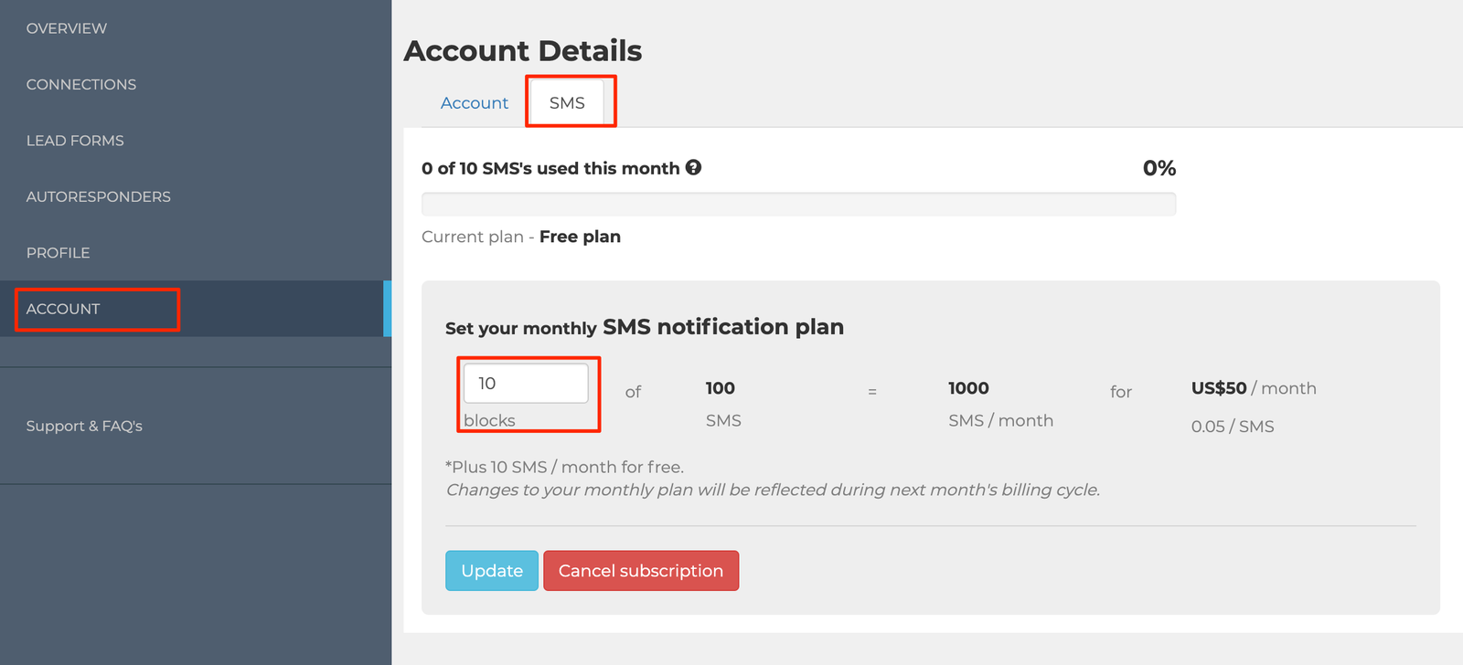Here's how to add an additional monthly subscription that will give you 100 or more SMS credits per month.