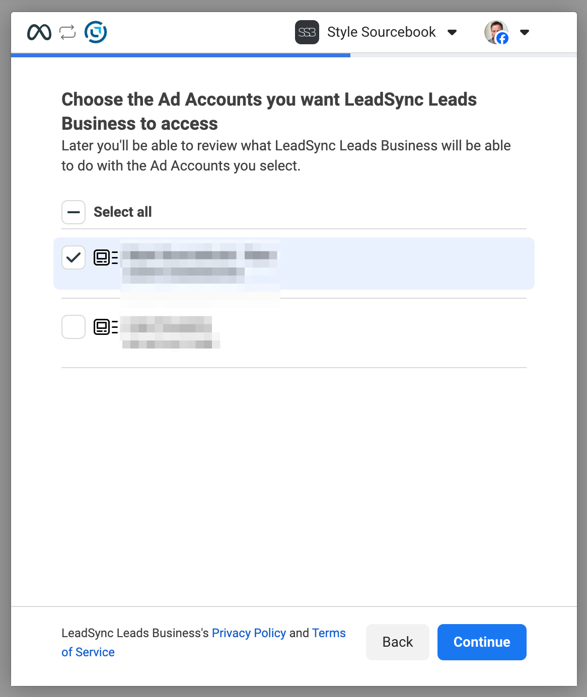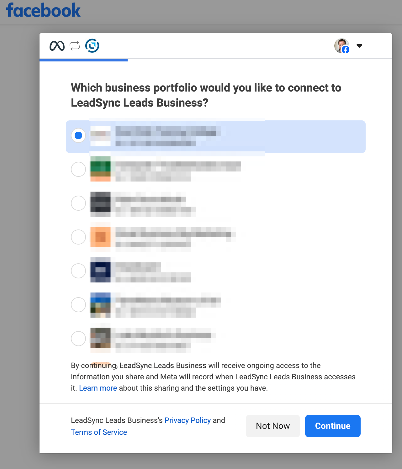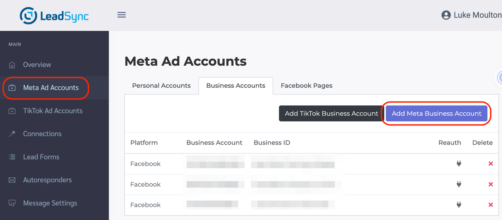 To add a Meta (Facebook) Business account to LeadSync, so that we can connect to leads from Pages connected to your business account, please do as follows: