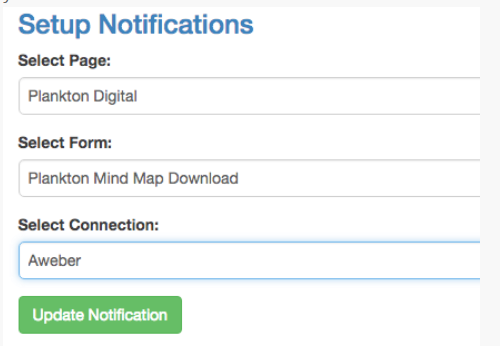 2. Select your Facebook Page, then the Lead Form, then the Connection you just added. Click Update Notifications and your done. NOTE: You need to have Admin access to the Facebook Page to be able to add the Form.