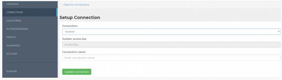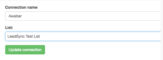 3. Now enter a Connection name – such as “Aweber”. Then hit update connection. You will then have the option to select your Aweber list from the dropdown.