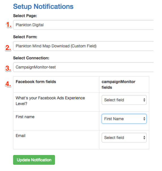- Select your Page, Form, Connection and match your fields and then click "Update Notification"