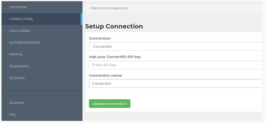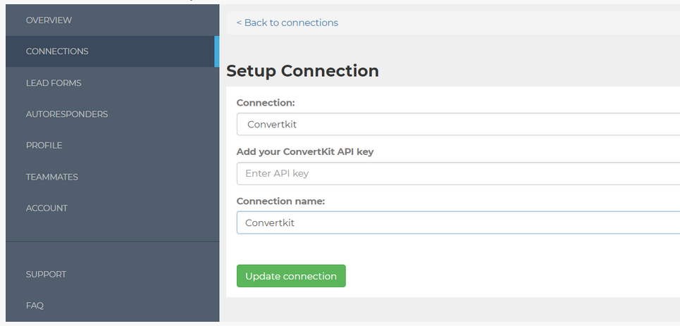 - Paste the API Key into the LeadSync form, call the connection something appropriate and click update.