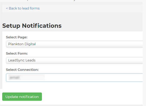 - Select the Page your advertising from, the Form you're driving leads to and the Kit connection you just created. Hit Update Notifications and you're done.
