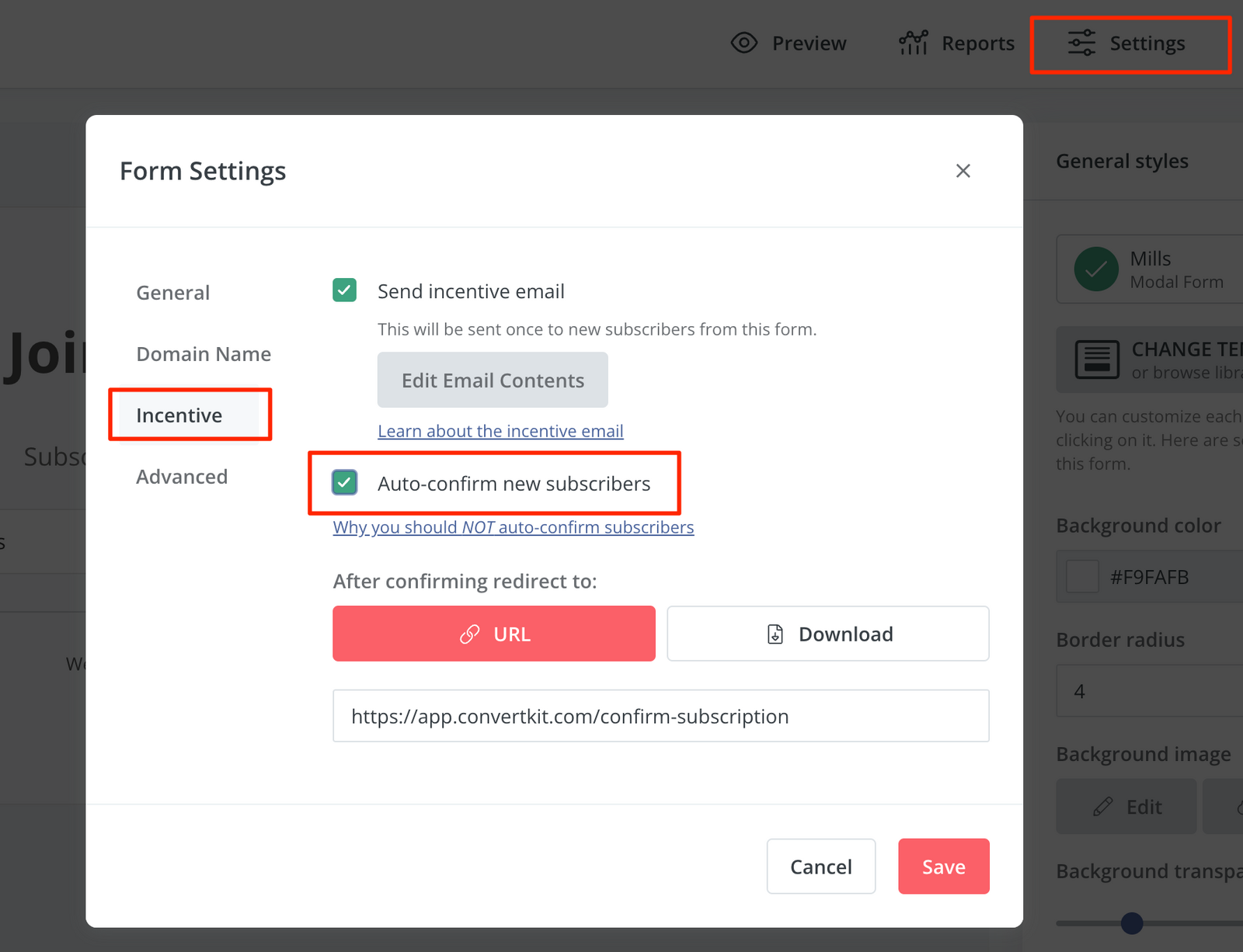 Go to Settings > Incentive, then check Auto-confirm new subscribers.