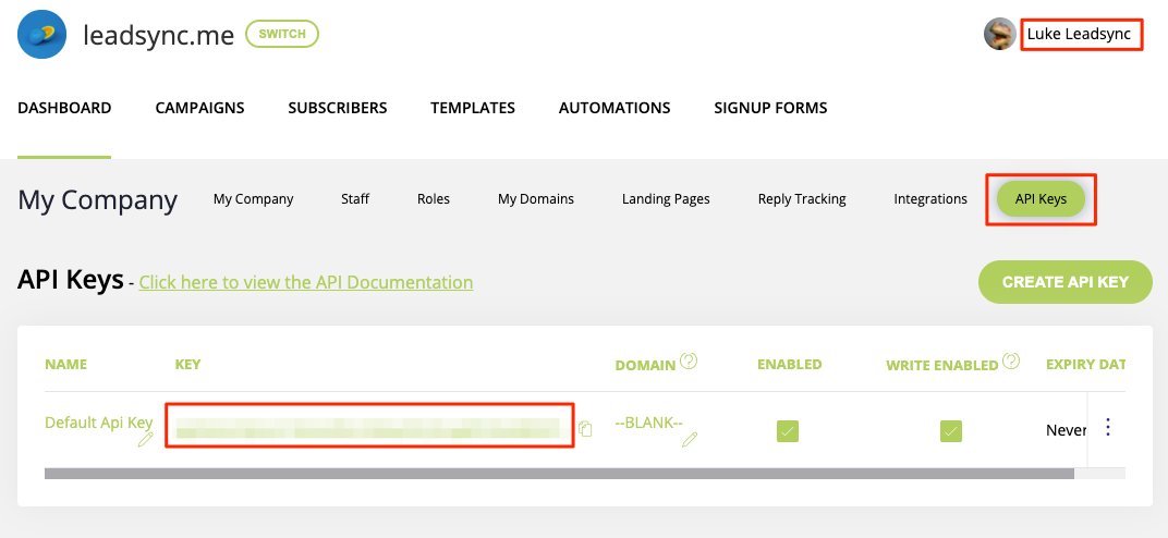- Paste the API Key into the API Key field in your LeadSync connection and click Update.