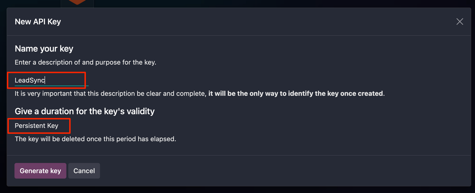 Create you API Key: be sure to make your API "Persistant" when you create it. Copy and paste the API key from Odoo into your LeadSync connection setting, then click Update.