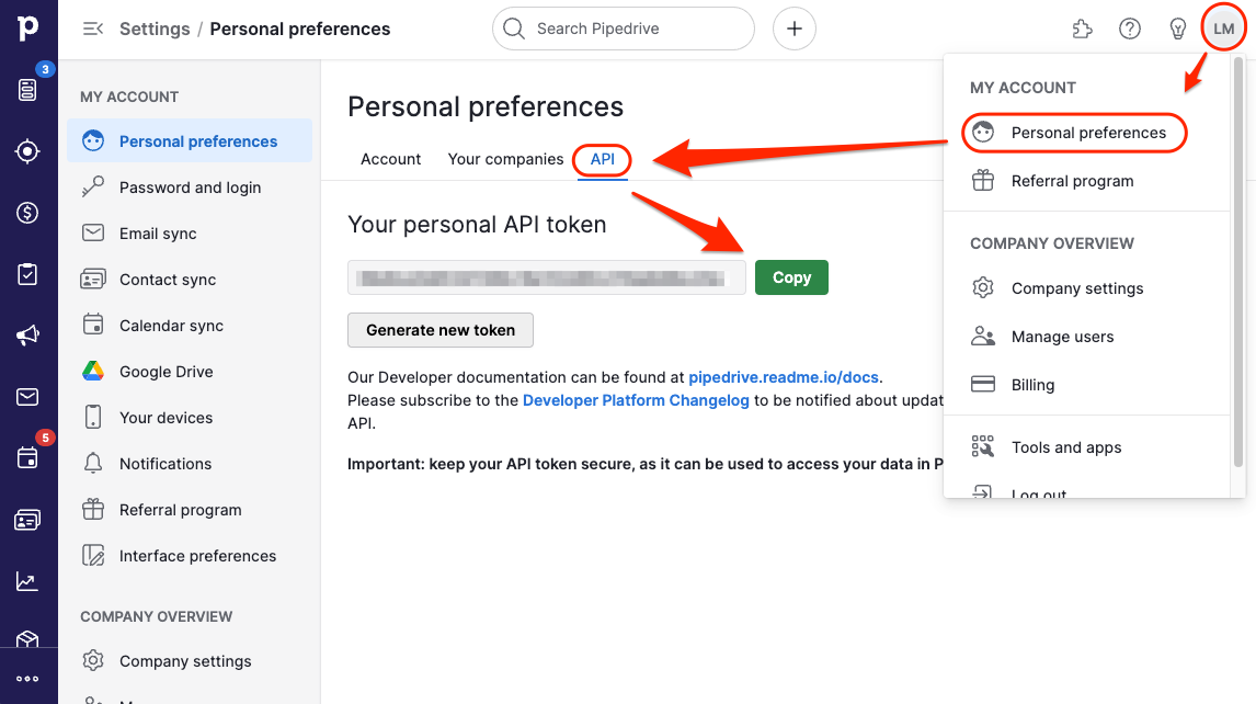 - Login to your Pipedrive account. From your user profile drop down menu at the top right of screen, go to Personal Preferences, then the API tab. Copy your personal API token.