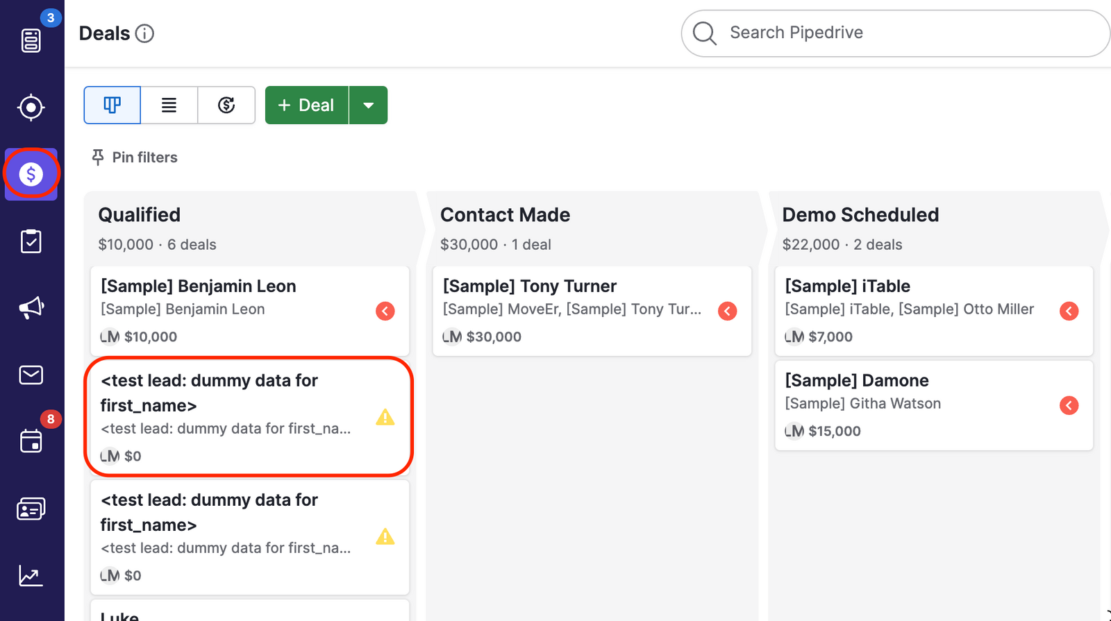 Note: Leads will Appear in the PipeDrive Deals Section¶