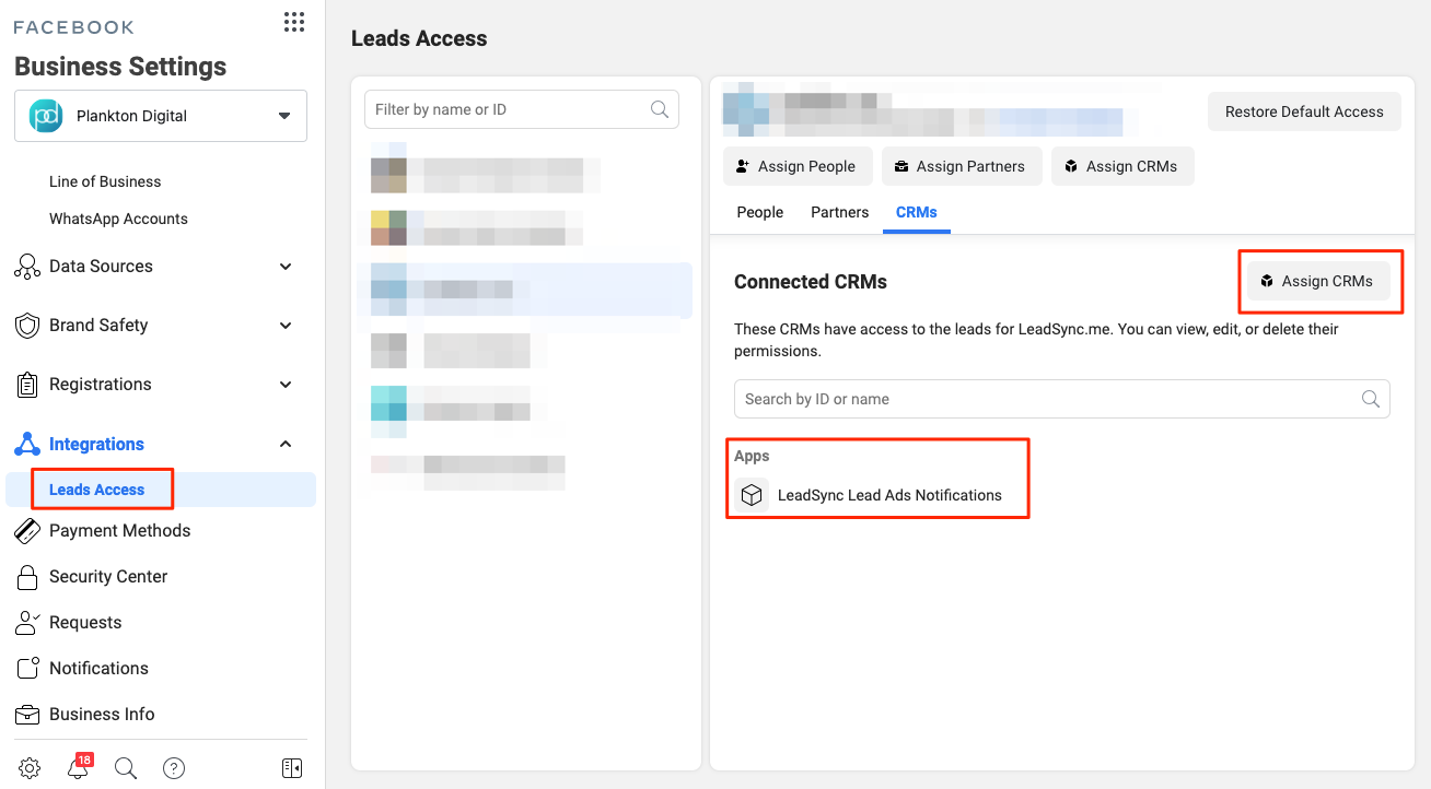 Now click on the CRMs and check to see if LeadSync Lead Ads Notifications is listed under apps. If it's not, click Assign CRM's and add it.